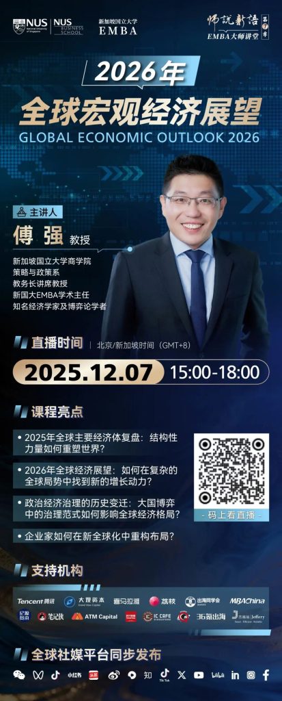 在本期“师说新语”大师讲堂中,经济学者、新加坡国立大学商学院策略与政策系教务长讲席教授、EMBA学术主任傅强教授,将以独到的视角和深厚的学术底蕴,带您抽丝剥茧、层层解析: