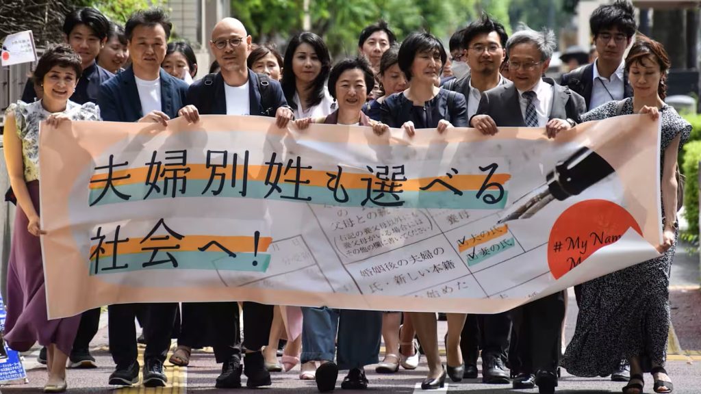 日本《民法》规定,夫妻必须使用同一姓氏。婚后,双方可以协商采用哪一方的姓,但在约 95% 的婚姻中,通常由女性改随夫姓。批评者指出,这一做法折射出日本社会以男性为主导。事实上,不少女性在职场中仍选择沿用娘家姓,而在法律和官方文件中则使用婚后姓氏。