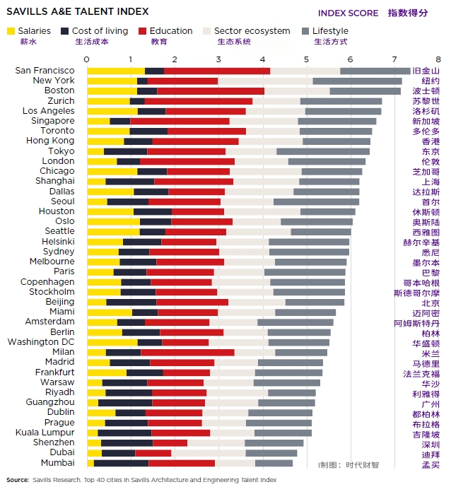 根据报告,全球建筑与工程人才最集中的城市仍由美国的旧金山和纽约主导,欧洲则由苏黎世和伦敦领先。在亚太地区,新加坡与香港、东京并列区域核心人才中心,反映其在区域建筑设计与工程技术领域的重要地位。